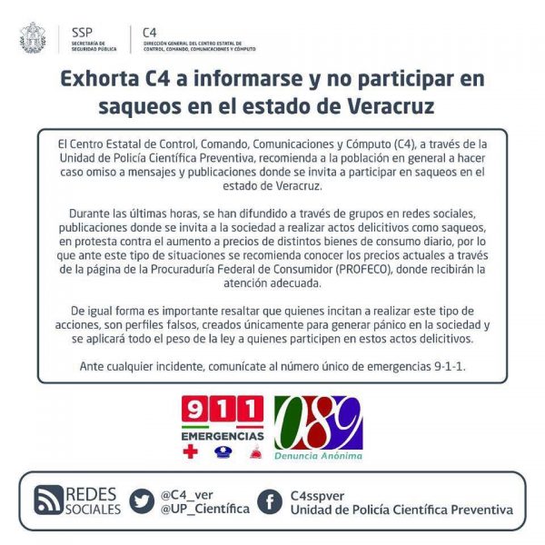 Xalapa, Ver.- Mediante un inusual comunicado, el Centro de Control Comando (C4) del Gobierno del Estado exhortó a la población «a informarse y no participar en saqueos en el estado de Veracruz».