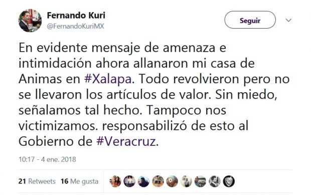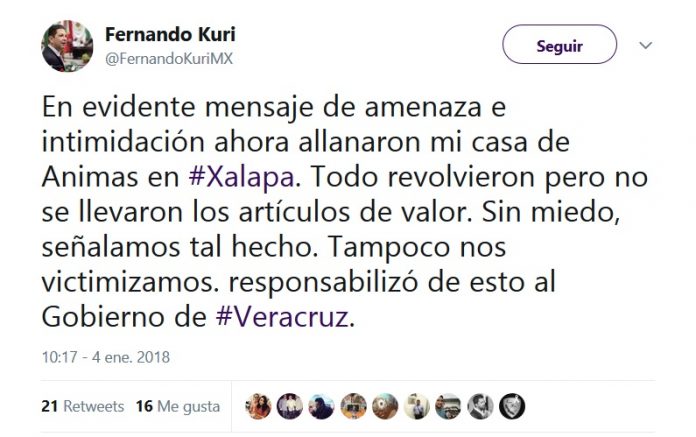 Xalapa, Ver.- Mediante un tuit desde su cuenta @FernandoKuriMX, el diputado local Fernando Kuri Kuri informó que su casa fue allanada, a la vez que responsabilizó al Gobierno del Estado de Veracruz de este acto que señaló como intento de intimidación.