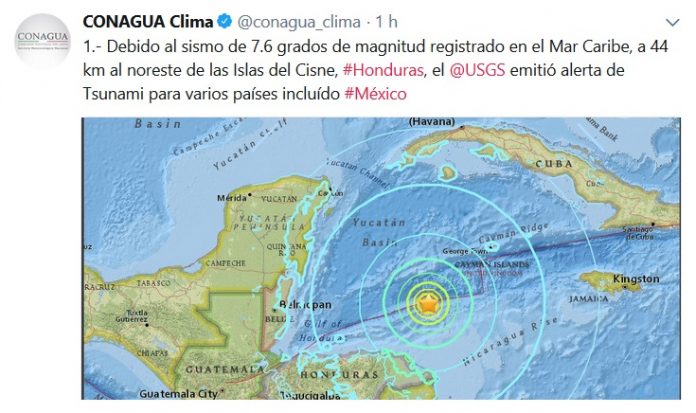1.- Debido al sismo de 7.6 grados de magnitud registrado en el Mar Caribe, a 44 km al noreste de las Islas del Cisne, #Honduras, el @USGS emitió alerta de Tsunami para varios países incluído #México pic.twitter.com/LmDWS9ss4O