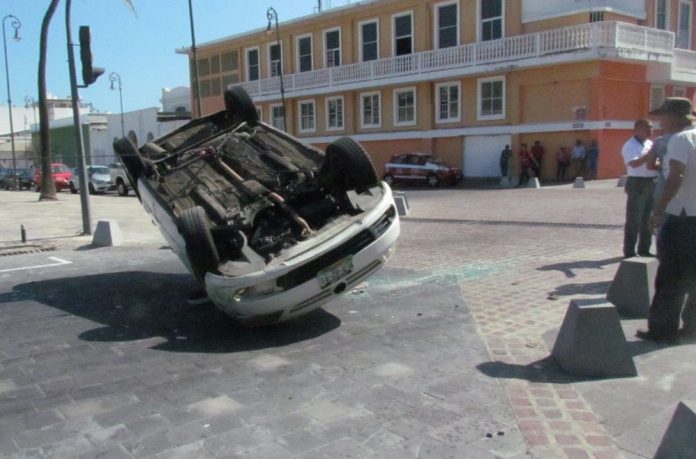 Veracruz, Ver.- Un auto compacto quedó volcado y con las llantas hacia arriba, luego de chocar contra un «bolardo» de concreto ubicado sobre la avenida Gómez Farías en el centro de esta ciudad.