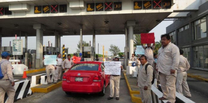 Integrantes de la Coordinadora Nacional Plan de Ayala liberaron las plumas de la caseta de Fortín de las Flores para poder pasar sin pagar el peaje de unos 30 autobuses que los acompañan.