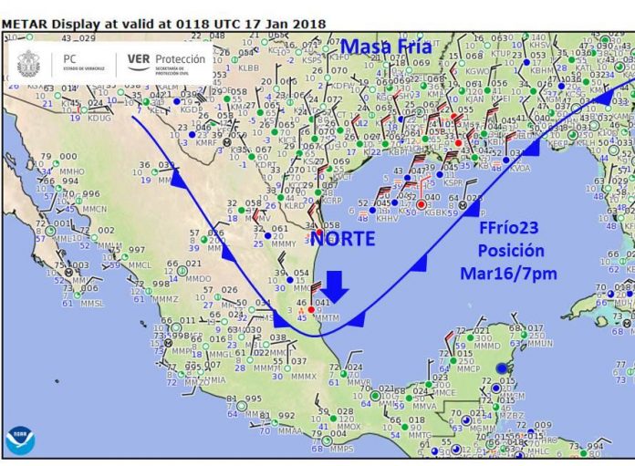 Xalapa, Ver.- De acuerdo al más reciente reporte emitido por la Secretaría de Protección Civil la noche de este martes, tras el paso del Frente Frío número 23 por la entidad veracruzana, se espera un evento de «Norte» con rachas que podrían alcanzar los 80 km/h.