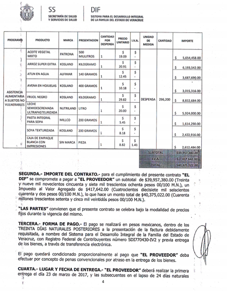 El contrato para esas adquisiciones, de acuerdo a los documentos que aparecen en distintos medios de comunicación y que se pueden ver en la cuenta http://www.difver.gob.mx, detalla la forma como se negoció para adquirir 296 mil 200 despensas con un costo de 40 millones 375 mil 22 pesos.