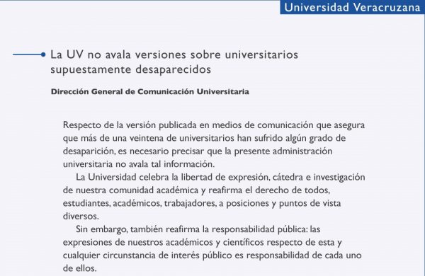 Xalapa, Ver.- Mediante un comunicado la Universidad Veracruzana señaló no avalar versiones sobre universitarios supuestamente desaparecidos; expuesto por la investigadora Rosío Córdoba Plaza referente a los secuestros de los que han sido víctimas integrantes de la comunidad universitaria.