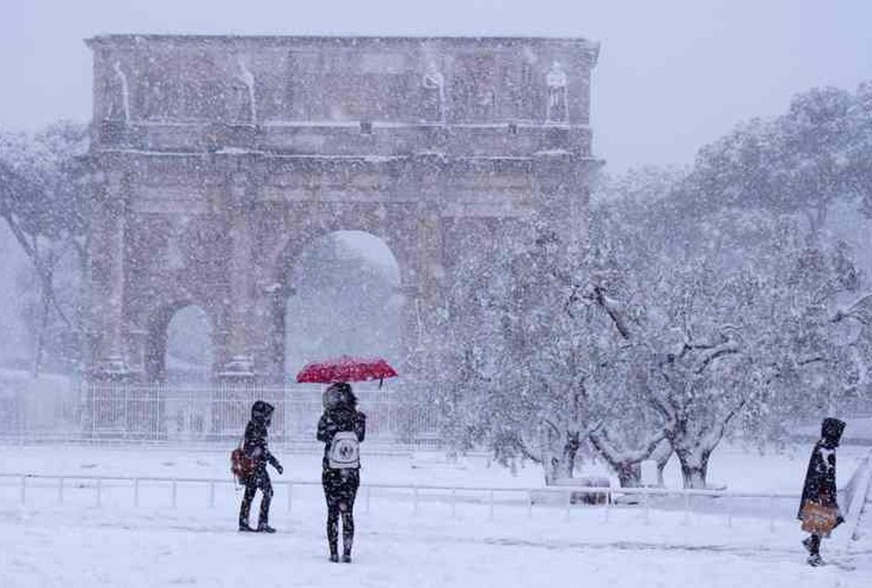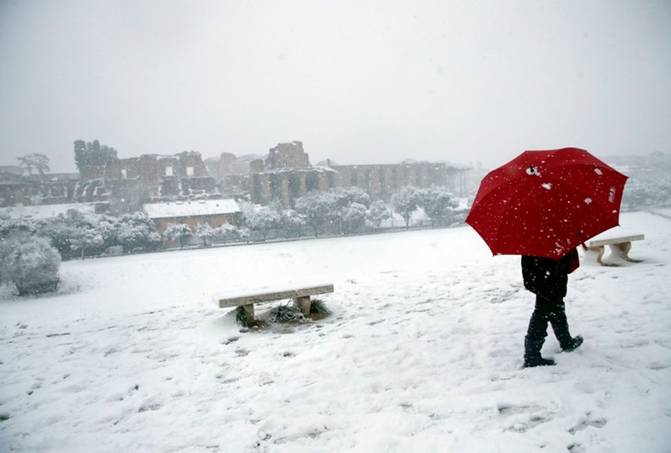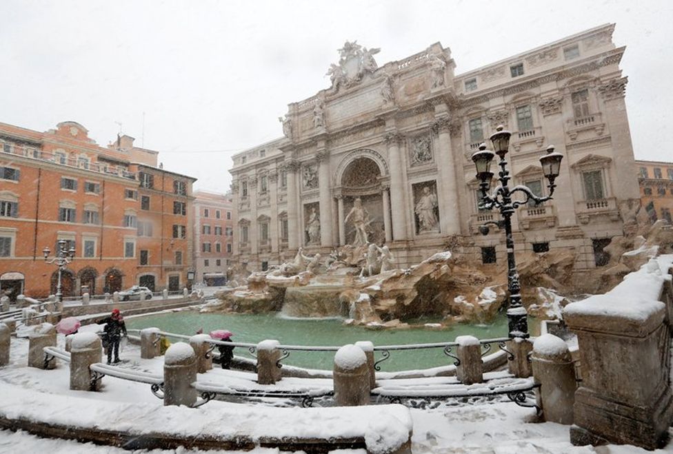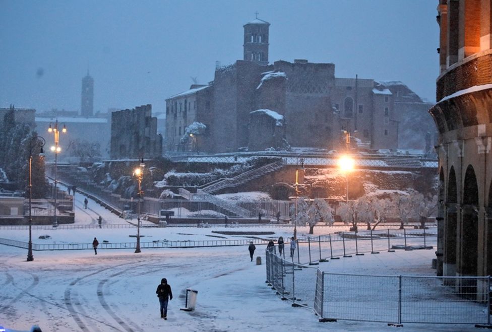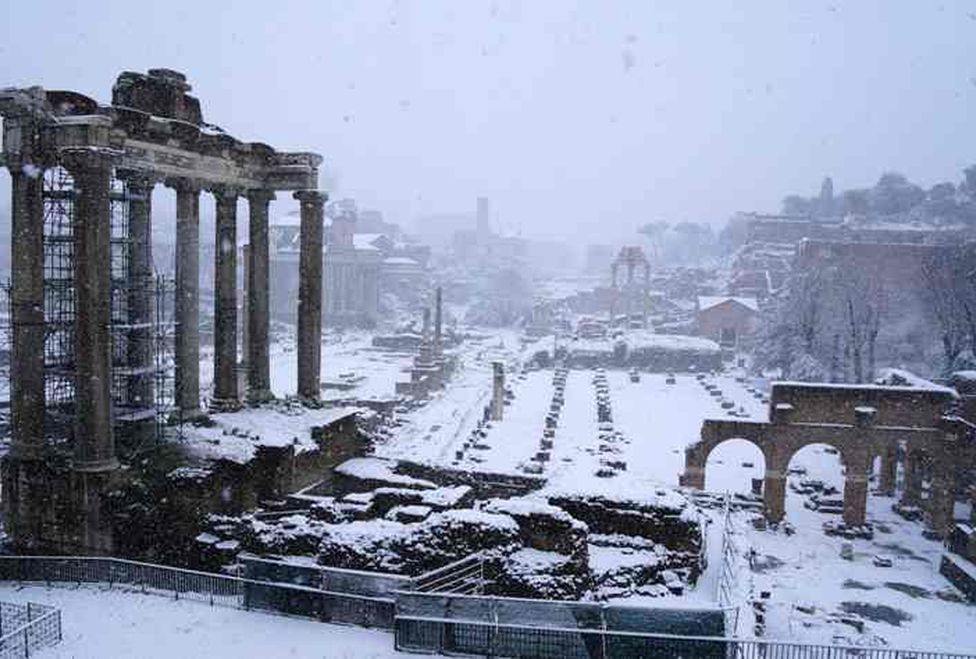 Los servicios de tren, avión y autobús de Roma quedaron paralizados y la agencia de protección civil de Italia incluso movilizó al ejército para ayudar a limpiar las calles cubiertas de aguanieve, ya que la ciudad acostumbrada a los inviernos suaves estaba cubierta por una gruesa capa de nieve.