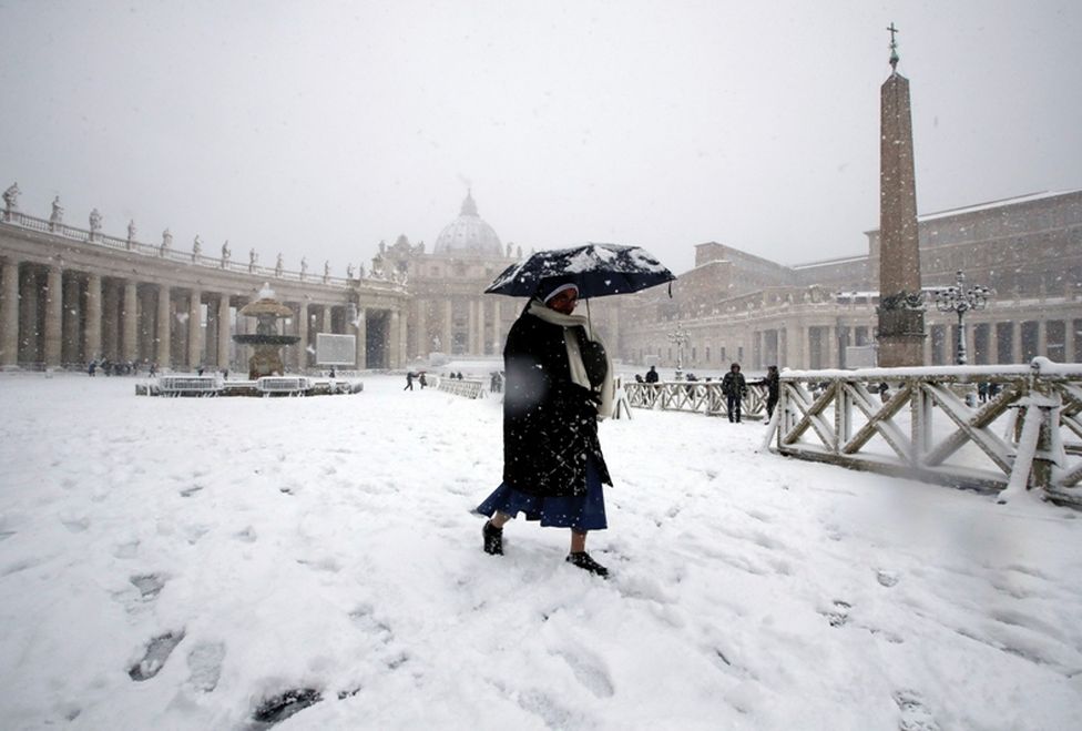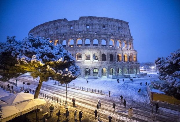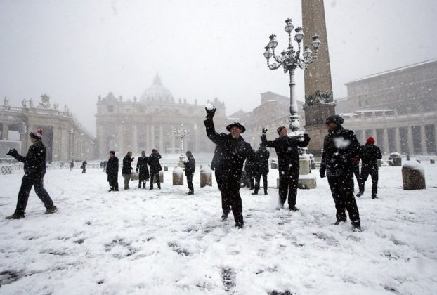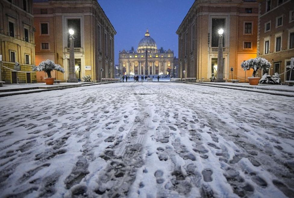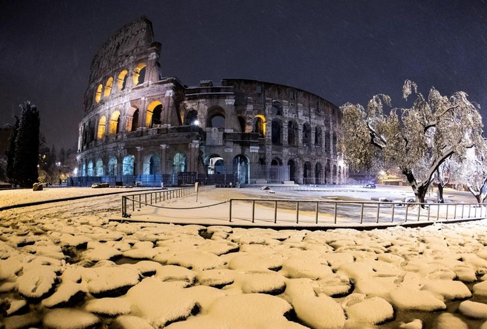 La capa de nieve vistió de blanco el Coliseo y desató batallas de bolas en la plaza de San Pedro del Vaticano. Según el servicio meteorológico 3bmeteo, en el centro de la ciudad eterna la capa de nieve se sitúa en entre cinco y diez centímetros.