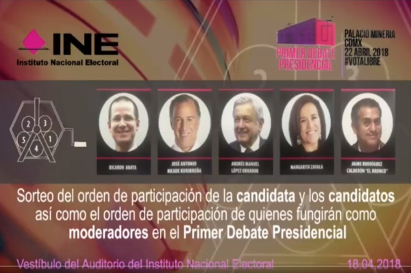 De acuerdo con el sorteo la candidata independiente, Margarita Zavala obtuvo el número 1, José Antonio Meade el 2, Ricardo Anaya el 3, Andrés Manuel López Obrador el 4 y Jaime Rodríguez el 5. Estos números determinarán el orden de participación de cada uno de los participantes