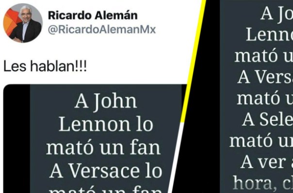 “A John Lennon lo mató un fan, A Versace lo mató un fan, A Selena la mató una fan, A ver a qué hora, chairos”, decía el mensaje que Ricardo Alemán publicó en Twitter.