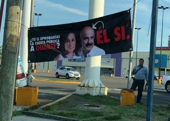 Aparentemente es una campaña «negra» contra los candidatos de Morena, pues las mantas hacen alusión a lo dicho por Ricardo Ahued, cuando aseguró que nunca le aprobó una cuenta pública a Duarte y en esta manta se pretende señalar que sí.