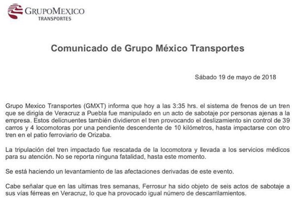 Luego del sabotaje y choque de un tren en Orizaba, la empresa Grupo México Transportes (GMXT), mediante un comunicado hizo un exhorto a las «autoridades responsables a garantizar las condiciones de seguridad necesarias que permitan la continuidad en la operación».