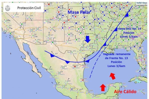 Para hoy, el frente No. 14 se extenderá como estacionario sobre el centro, oriente y sureste del país, incrementando el potencial de lluvias sobre dichas regiones. La masa de aire fría asociada al frente ocasionará descenso en la temperatura sobre el noreste, oriente y centro de la República, además de evento de “Norte” con rachas de viento mayores a 80 km/h en el sur de Veracruz, Istmo y Golfo de Tehuantepec; y rachas superiores a 60 km/h en el litoral de Tamaulipas, Tabasco y Campeche. Por otro lado, una corriente en chorro sobre el noroeste y norte de México, favorecerá rachas de viento que pueden superar los 60 km/h con posible formación de tolvaneras en la Península de Baja California, Sonora, Chihuahua y Durango. Los sistemas meteorológicos mencionados ocasionarán los siguientes potenciales de lluvia: