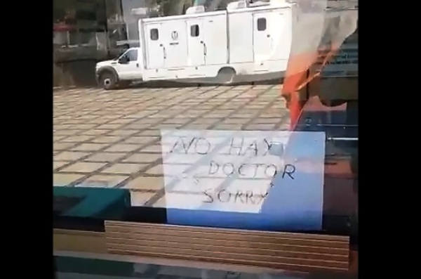 Mediante un video, se da testimonio que en las puertas de esta Clínica Hospital número 18 del Instituto Mexicano del Seguro Social, ubicada sobre la calle Benito Juárez entre Justo Sierra y La Cantarilla de esta localidad, hay una cartulina pegada con la leyenda «NO HAY DOCTOR SORRY», por lo que no se está brindando atención médica a la población.