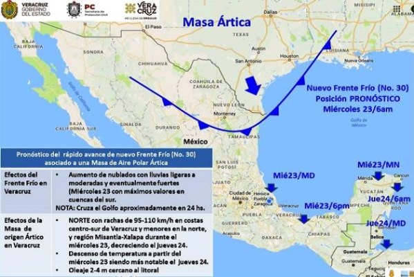 El pronóstico para el miércoles 23 es de lluvias dispersas, evento de norte fuerte a violento con rachas máximas entre 100 y 115 km/h en la costa central y con nuevo descenso de temperatura. Asimismo, se mantendrán heladas de fuertes a ocasionalmente severas en las regiones de Huayacocotla, El Totonacapan, Sierra de Misantla, valle y faldas del Cofre de Perote y Pico de Orizaba, por las noches y madrugadas, en los días posteriores.