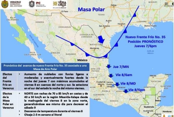 Será el viernes 8 de febrero cuando este FFrío35 impacte el territorio veracruzano, provocando lluvias y evento de «Norte» con rachas de hasta 85 Km/h en la zona de costa mientras que en Misantla y Xalapa podrían ocurrir rachas de 50 Km/h