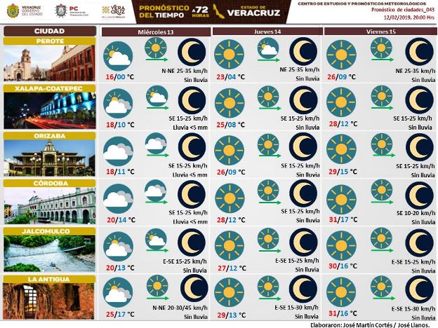 Xalapa y Perote, con temperaturas máximas por arriba de los 23 y 25 grados, mientras que en municipios como Coatepec, Xico, Jalcomulco se espera que reabasen los 25 y hasta 28 grados centígrados. En la costa, municipios como Tuxpan, Veracruz-Boca del Río y Coatzacoalcos se sentirán temperaturas arriba de los 26 grados.