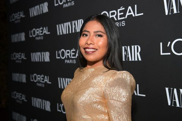 A la alfombre roja llegaron cientos de estrellas, pero sin duda Yalitza Aparicio se robó las miradas con uno de los mejores looks que ha sacado. La intérprete de ‘Roma‘ lució para la ocasión un vestido dorado con hombros abullonados, mangas a tres cuartos y holanes, sin escote.