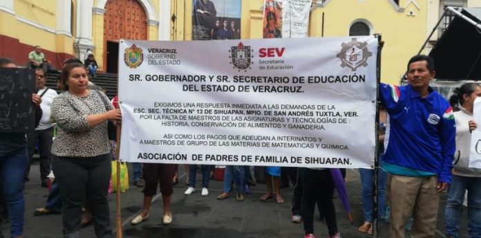 Xalapa, Ver.- Un grupo de padres de familia se manifestó esta mañana en la Plaza Lerdo frente al Palacio de Gobierno, los padres de familia, provienen de la Secundaria Técnica de Sihuapan, municipio de San Andrés Tuxtla.