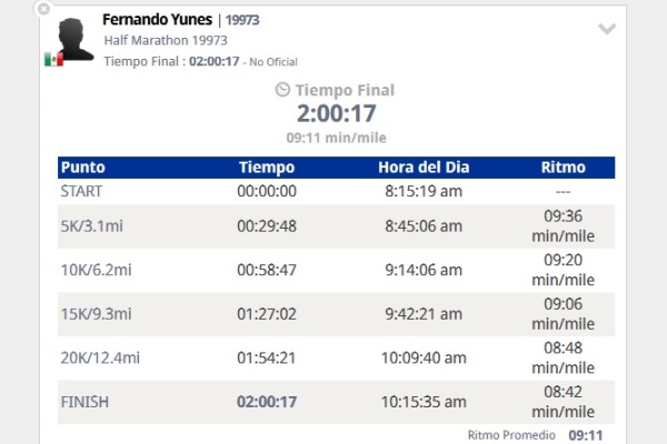 De acuerdo al portal https://liveresults.nyrr.org Fernando Yunes «from Boca del Rio» se inscribió para el medio maratón de este domingo, recibiendo el número de participante 19973.