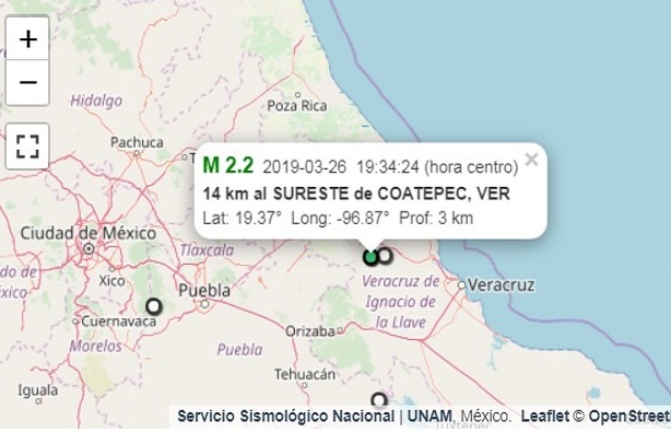 Fue el pasado martes 26 de de los corrientes, a las 19:34 horas cuando, de acuerdo a datos aportados por el SSN, un sismo de 2.2 grados ocurrió 14 kilómetros al Sureste de Coatepec.