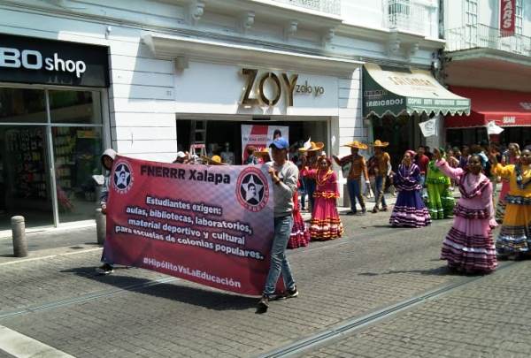 Xalapa, Ver.- Un grupo de «estudiantes» vestidos con trajes regionales, se manifestaron con una marcha por la céntrica calle Enríquez de esta capital, exigen bibliotecas, aulas, laboratorios; portan una bambalina con las siglas FNERRR.