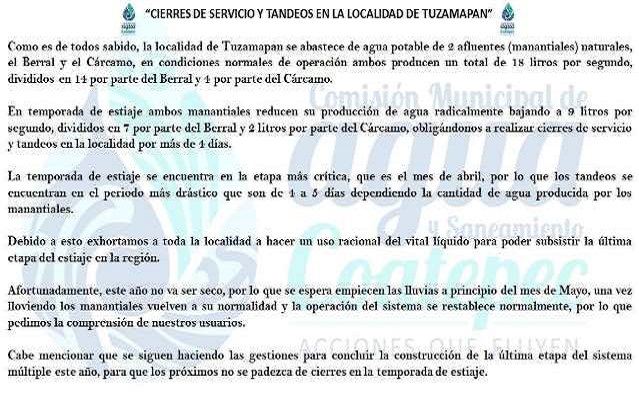 «La localidad de Tuzamapan se abastece de agua potable de 2 afluentes (manantiales) naturales el Berral y el Cárcamo, en condiciones normales de operación ambos producen un total de 18 litros por segundo, divididos en 14 por parte del Carcamo» – detalla el mensaje difundido.