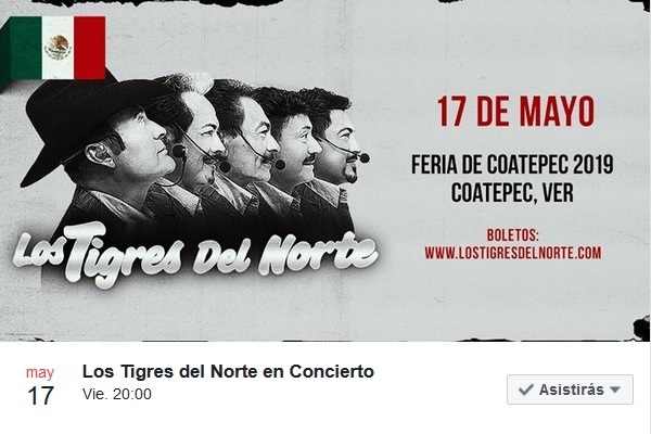 Coatepec, Ver.- Esta tarde, en el portal y Fan-Page del grupo «Los Tigres del Norte» apareció como fecha de próximo evento el concierto en la Feria Internacional del Café y la Orquídea Coatepec 2019, el próximo 17 de mayo.