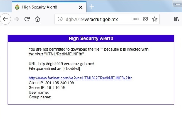 Fue esta mañana, cuando los interesados en solicitar informes a través del portal http://dgb2019.veracruz.gob.mx/ encontraron que los dirigía a una pantalla con fondo blanco y un mensaje en idioma inglés en el que se advierte que el sitio está infectado por un virus.