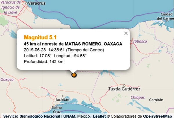 El epicentro del sismo fue localizado 28 km al NORESTE de MATIAS ROMERO, OAX con Lat 17.06 Lon -94.86 y a una profundidad de 75 km .