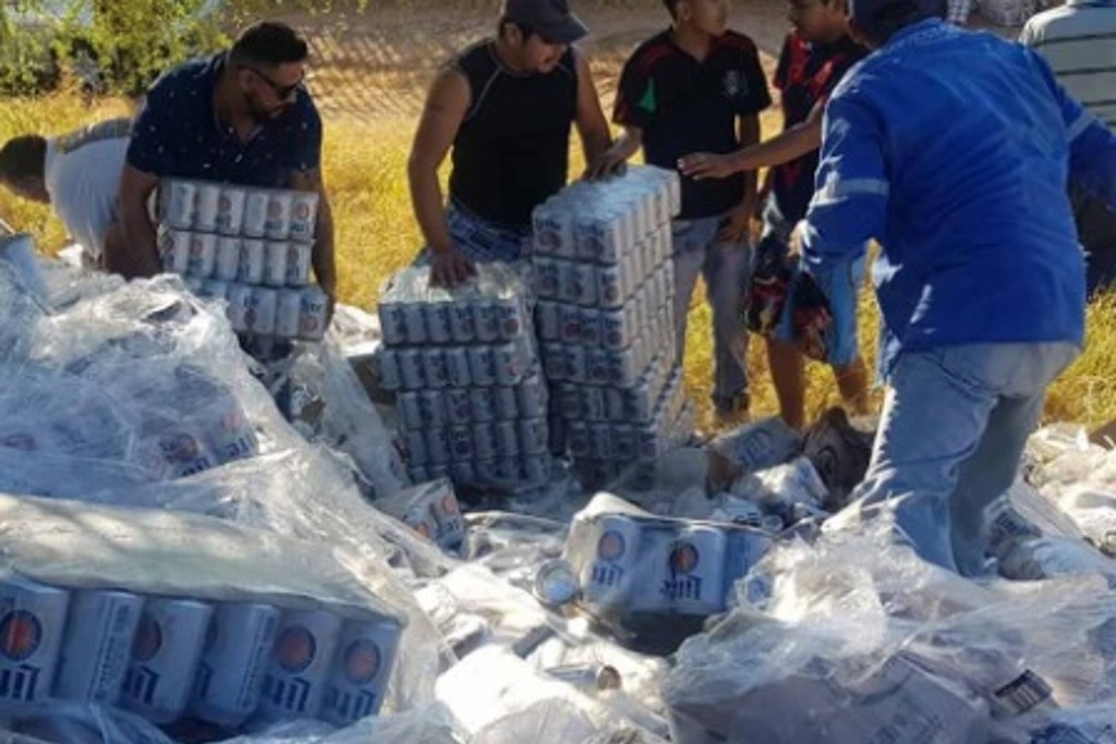 A pocos minutos del incidente, adultos, jóvenes y hasta abuelitas aprovecharon la volcadura de un tráiler para apoderarse de las cervezas que transportaba y que quedaron esparcidas sobre la vía.