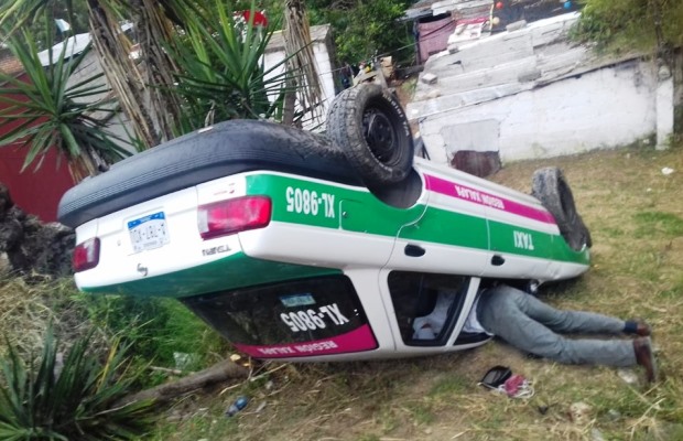 Se trató de la unidad de alquiler con número económico XL-9805 y cromática verde-blanco, cuyo chofer perdió el control y volcó de manera aparatosa.