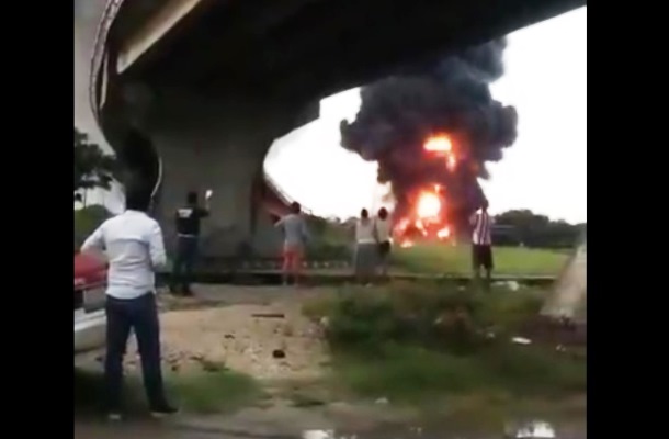 Coatzacoalcos, Ver.- Una pipa cargada con Diesel se salió del puente conocido como «Caracol» en la colonia Frutos de la Revolución y terminó cayendo en un terreno baldío, para en minutos arder en llamas; el chofer logró ponerse a salvo.