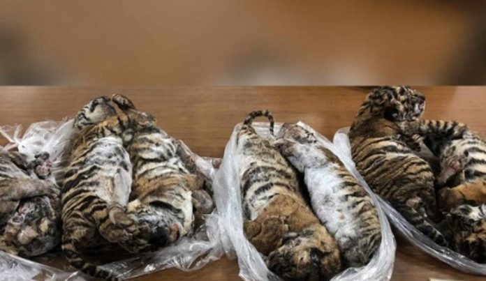 Un sujeto fue detenido tras hallársele siete tigres bebés congelados en el interior de su vehículo, en un estacionamiento de Hanói, en Vietnam.