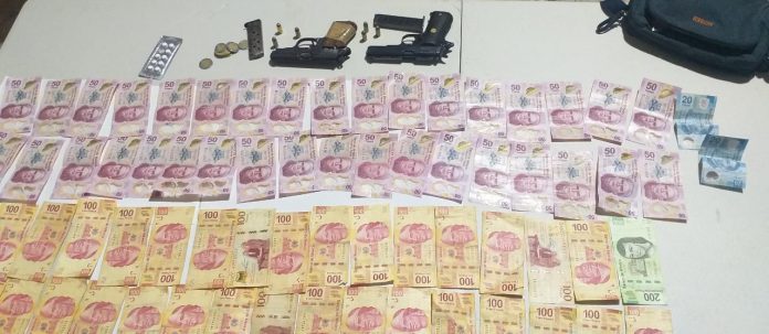Durante la inspección les hallaron dos pistolas tipo escuadra, ambas calibre 3.80; una, marca Llama Mex, con tres cartuchos útiles; la otra, marca Walter, matrícula 852450 y tres cartuchos, así como billetes de distinta denominación.