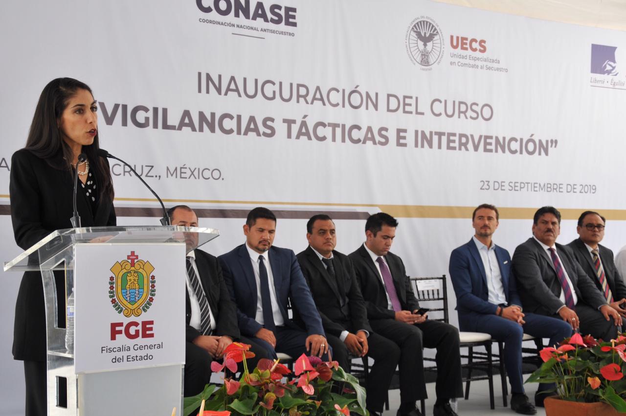 XALAPA, VER. 23 de septiembre de 2019.- La encargada del Despacho de la Fiscalía General del Estado (FGE), Verónica Hernández Giadáns, presidió la ceremonia de inauguración del curso “Vigilancias Tácticas e Intervención”, impartido por la Secretaría de Seguridad y Protección Ciudadana a través de la Coordinación Nacional Antisecuestro (CONASE) dirigido a personal de la Unidad Especializada en Combate al Secuestro (UECS).