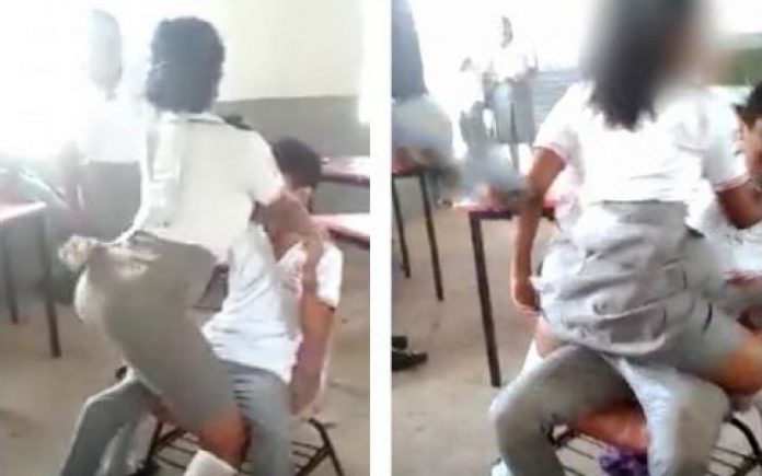 Ante la falta de vigilancia de la dirección y maestros de esta institución educativa, un grupo de jóvenes, comenzaron a bailar al estilo «table dance», y se observa en las fotografías difundidas a una jovencita que se le monta de frente a un compañero que se encuentra sentado en una silla, mientras le baila cadenciosamente friccionando su aparato reproductor con el del joven.