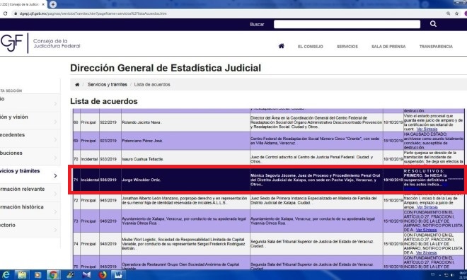 Este lunes en el tablero de avisos del Sistema Integral de Seguimiento de Expedientes del Consejo de la Judicatura, se resolvió el amparo 936/2019 del Juzgado Décimo Octavo de Distrito, en el cual se le niega de manera definitiva el amparo en contra de actos privativos de la libertad.