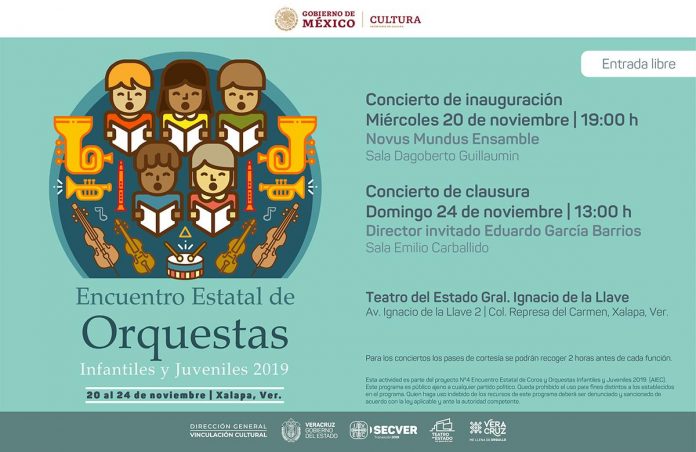 Xalapa, Ver., 19 de noviembre de 2019.- El Instituto Veracruzano de la Cultura (IVEC) llevará a cabo el Encuentro Estatal de Orquestas Infantiles y Juveniles de la Escuela Libre de Música, los días 20 y 24 de noviembre en el Teatro del Estado “Gral. Ignacio de la Llave”. La entrada es libre con boleto de control.