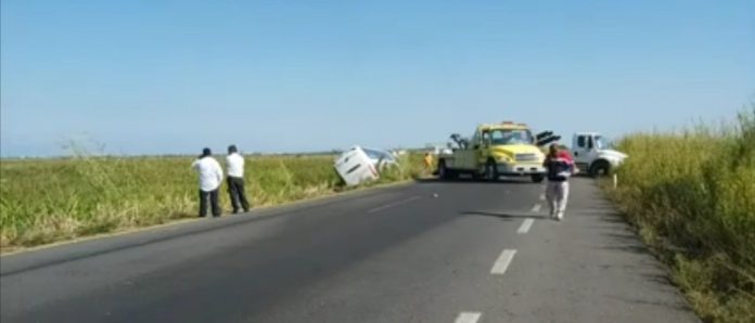 Coatzacoalcos, Ver. 21 de noviembre del 2019.-La mañana de este jueves un autobús de turismo con varios pasajeros, volcó en la carretera Minatitlan-Coatzacoalcos, cercano al ejido Estereo del Pantano.