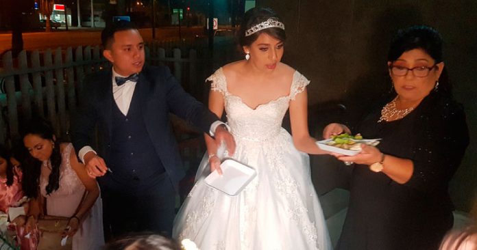 “Buenas noches, traemos unos platillos; pechugas, papas y verduras, no sé si tengan hambre o para que nos acompañen a nosotros a cenar. Sí, para darles un regalo de parte de los novios también.” Padres.