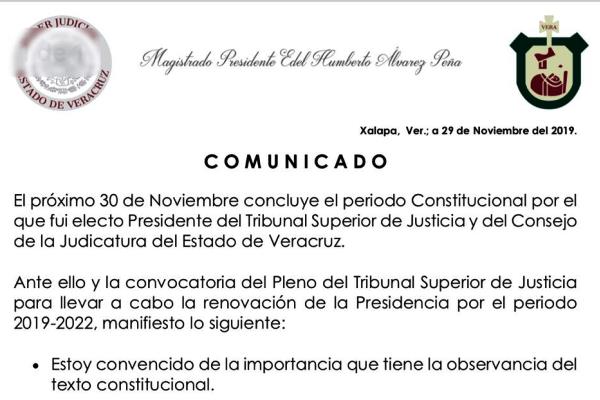 En la misiva que se hizo circular, Alvarez Peña agradece a los magistrados, jueces, consejeros así como al gobernador del Estado de Veracruz, Cuitláhuac García y al presidente de la Legislatura, Adrián Ríos Uribe.