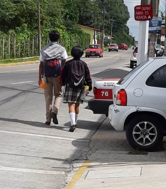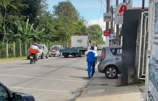 Jóvenes estudiantes, señoras y adultos mayores constantemente deben descender a la cinta asfáltica para poder llegar a sus casas pues se trata de un local dedicado a la comercialización de pinturas que ocupa la banqueta como estacionamiento.