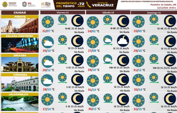 La oficina dependiente de la Secretaría de Protección Civil, dió a conocer su pronóstico para tres días, que va desde este viernes hasta el domingo, durante este periodo se prevén temperaturas cálidas para la gran parte de la entidad veracruzana.