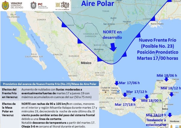 El pronóstico persiste en indicar el recorrido rápido del Frente frío núm. 23, actualmente en el noroeste del país, por la entidad entre la madrugada y tarde del martes 17, alcanzando la Península de Yucatán la mañana del miércoles 18 de diciembre (ver mapa), detrás del mismo la potente masa de aire polar asociada invadirá gran parte del país y el Golfo de México. Estos sistemas favorecerán en la entidad: