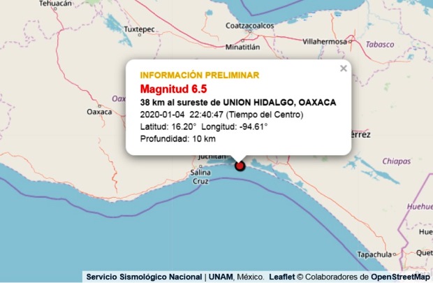Preliminar: SISMO Magnitud 6.5 Loc. 38 km al SURESTE de UNION HIDALGO, OAX 04/01/2020 22:40:47 Lat 16.20 Lon -94.61 Pf 10 km