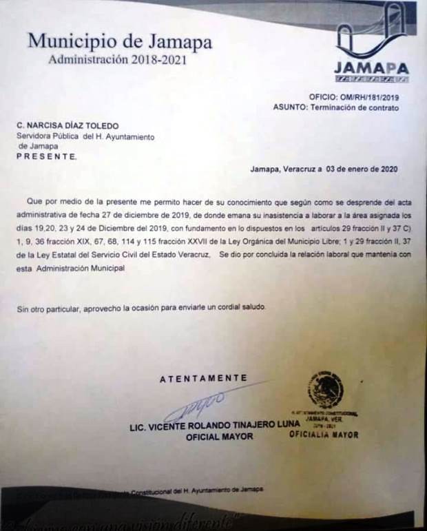 Balbina Vela Pérez se dijo ser víctima de un despido injustificado, ya que fue el pasado lunes cuando el Contralor del Ayuntamiento y el Oficial Mayor del Ayuntamiento la citaron para levantarle un acta administrativa porque desde hace varias quincenas ella se opone a firmar la nómina.