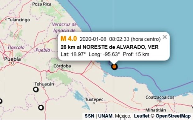 El SSN registró el movimiento telúrico a las 08:02 horas de este miércoles, teniendo su epicentro 26 kilómetros al Noreste del puerto de Alvarado, Veracruz; Lat: 18.97° Long: -95.63° y a una profundidad de 15 kilómetros.