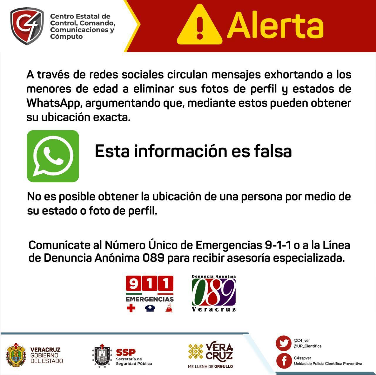 «A través de redes sociales circulan mensajes exhortando a los menores de edad a eliminar sus fotos de perfil y estados de Whatsapp argumentando que mediante estos se puede obtener su ubicación exacta… ESTA INFORMACIÓN ES FALSA»