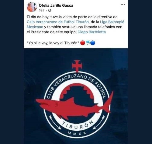 «El día de hoy, tuve la visita de parte de la directiva del Club Veracruzano de Fútbol Tiburón, de la Liga Balompié Mexicano y también sostuve una llamada telefónica con el Presidente de este equipo; Diego Bartolotta.Yo si le voy, le voy al Tiburón»