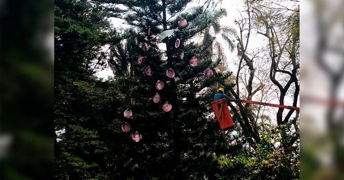 Xalapa, Ver.- Familiares de personas desaparecidas colocaron 60 esferas con rostros de sus desaparecidos en uno de los árboles del parque Benito Juárez de Xalapa, para visibilizar la desaparición de sus seres queridos.