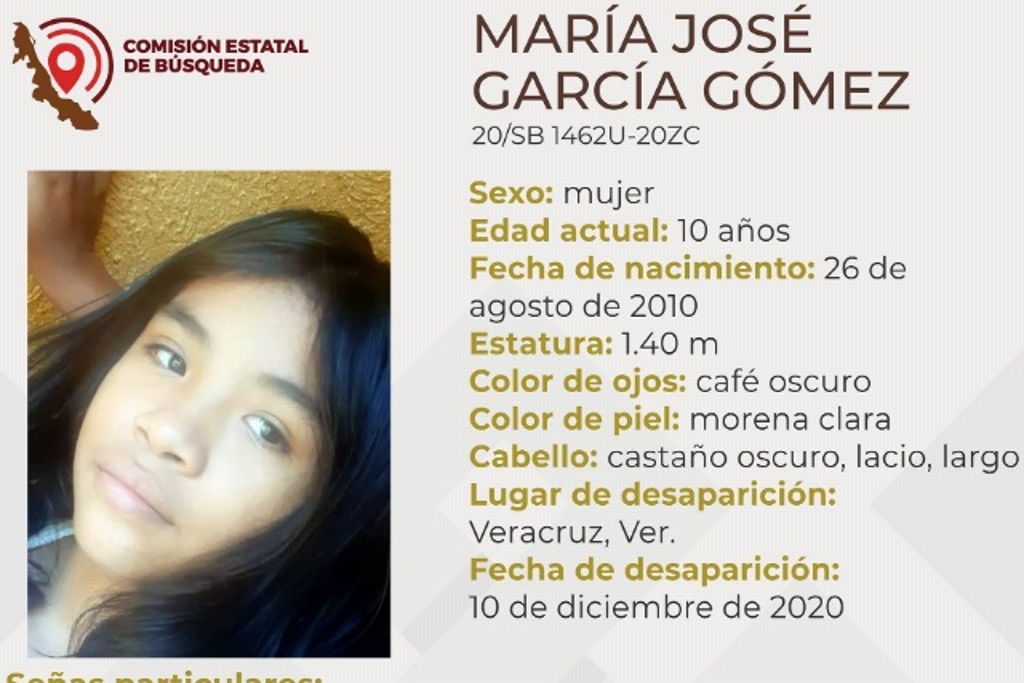 De acuerdo con la ficha de búsqueda emitida por la Comisión, García Gómez, de 10 años de edad, fue vista por última ocasión en la ciudad de Veracruz.